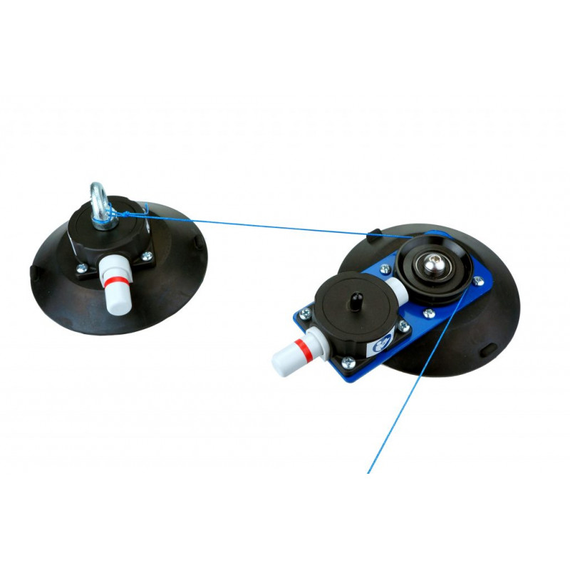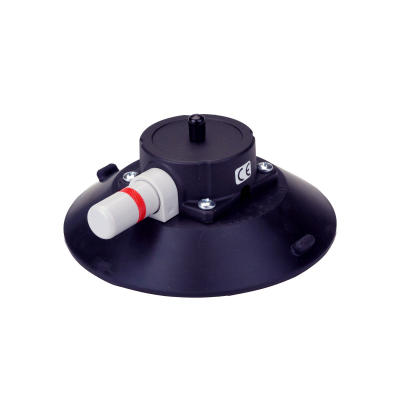 Rubber suction cup wich attaches to flat or curved, smooth, non-porous surfaces. The Red-line indicator warns user of any vacuum loss and the check valve allows re-pumping without loss of remaining vacuum. Lift tabs on pad edges permit instant release. Each cup is supplied with a vacuum pad protector.