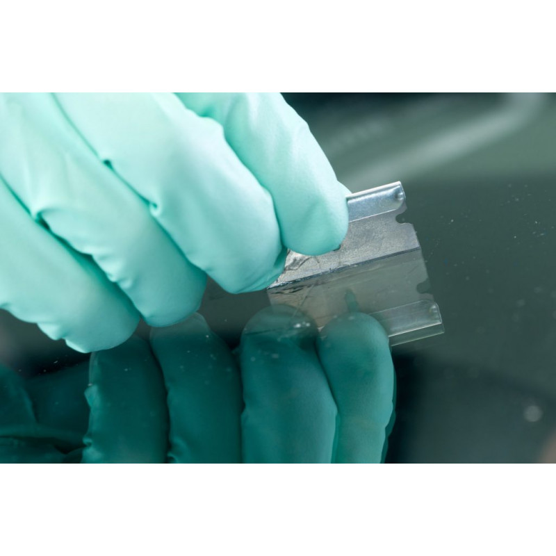 Duobond single edge razor blades are used during windshield repair once the UV-resin and Impact-Filler are cured with UV-light. The excess material can than be removed with a razor blade by scraping it in vertical position over the glass surface. As the special used steel is softer than glass it will not damage the glass in this way. These razor blades can also be used removing other types of adhesive residues or films.