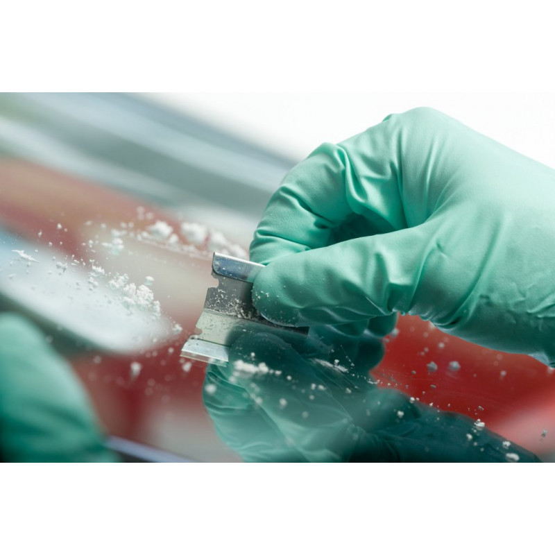 Duobond single edge razor blades are used during windshield repair once the UV-resin and Impact-Filler are cured with UV-light. The excess material can than be removed with a razor blade by scraping it in vertical position over the glass surface. As the special used steel is softer than glass it will not damage the glass in this way. These razor blades can also be used removing other types of adhesive residues or films.