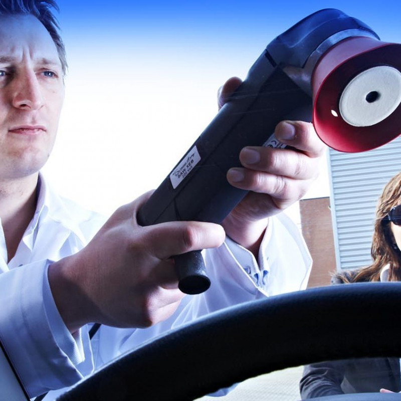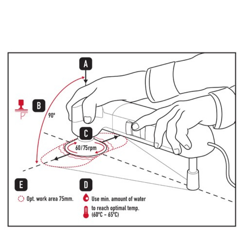 As glass is a very hard material the diameter of a polishing disc determines the pressure which is required to reach the correct pressure per cm² by the user. The bigger the disk the more pressure a worker needs to apply when polishing a scratch. With our Scratch AWay glass polishing disk of Ø50mm a minimum pressure is needed during polishing in horizontal and in vertical position (when the window is installed). This ideal size, low number of RPM and non-spattering makes polishing efficiently in any workshop or on location.